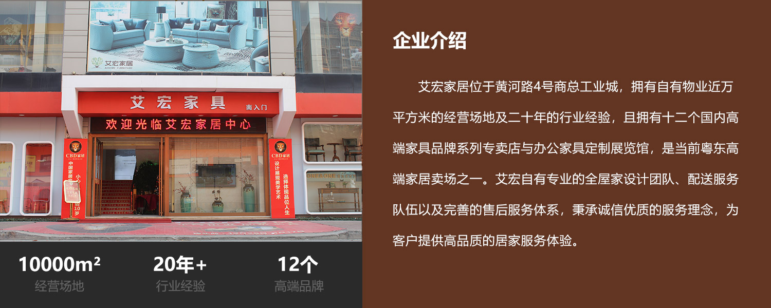 - 艾宏家居位于黃河路4號(hào)商總工業(yè)城,擁有自有物業(yè)近萬(wàn)平方米的經(jīng)營(yíng)場(chǎng)地及二十年的行業(yè)經(jīng)驗(yàn)。
